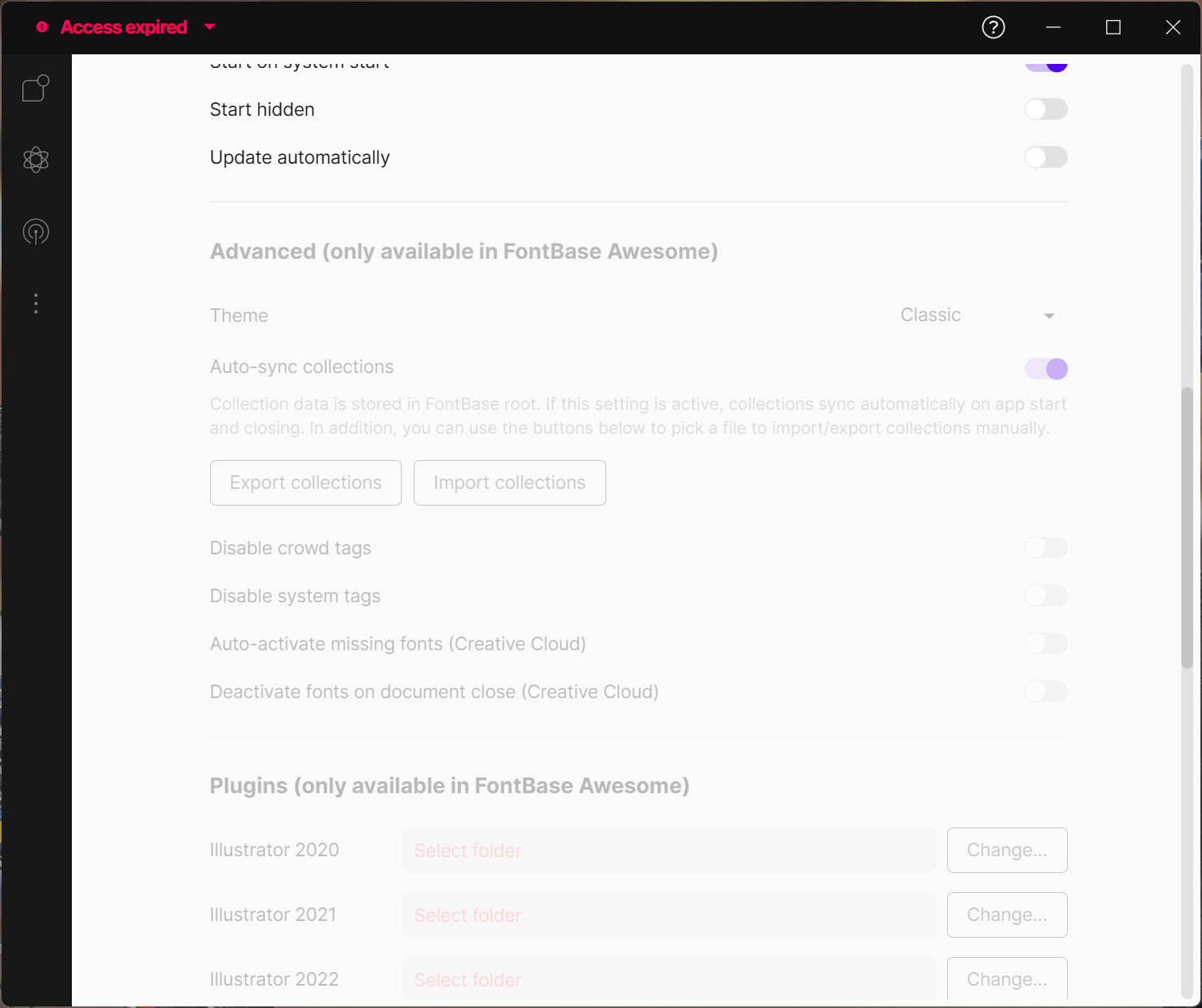 I was trying to add a new font and I noticed that it said Access expired in the top left corner. I have a forever license, so I’m not sure why my access has expired. To make matters worse, under settings I can no longer import or export collections or auto-activate missing fonts like I did in the past. I had auto-update turned off, so I’m not sure how this functionality got disabled. There’s a message that says "Advanced (only available in FontBase Awesome). So, you’re removing functionality that had been working when I purchased my forever license back in 2022 and you want me to pay for another subscription or forever license to get that same functionality back? That seems a little dishonest to me. What is going on here? I understand not getting access to brand new functionality that’s exclusively part of the FontBase Awesome package, but to remove old basic functionality like this for customers that thought buying a forever license meant the software would continue to function the way it did when we first purchased the license is pretty bad if it was done on purpose. If it’s just some bug please let me know how to fix it. Thanks. -