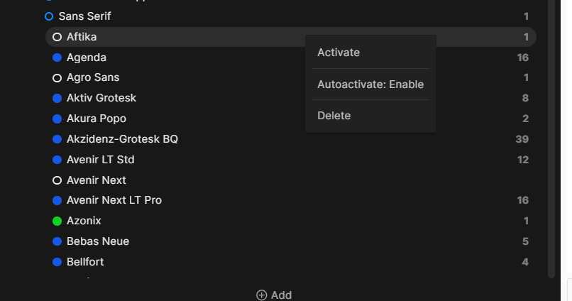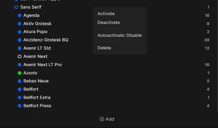 Where they are different is when you add another font into a folder. If a folder is Autoactive and you add a new font file into the folder, FontBase automatically activates it.