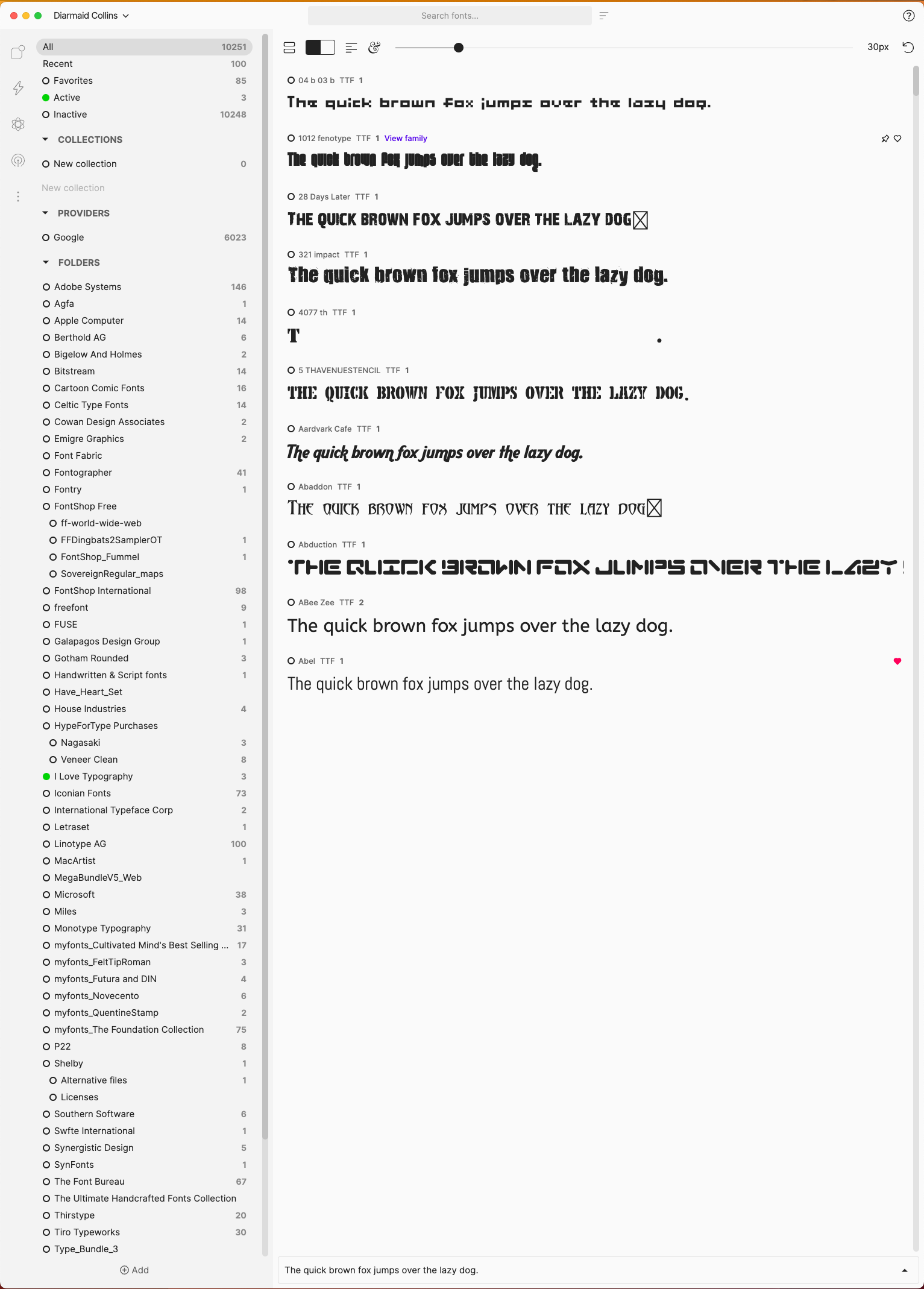 But you will notice how much of the available screen space is unusable (and is functionally/visually confusing - is it the end of the list or do I need to scroll?). The only way I can fill the screen is by viewing the font at 100px but I don’t get to preview many of the font’s characters (in grid view), which limits Fontbase’s possible usefulness.